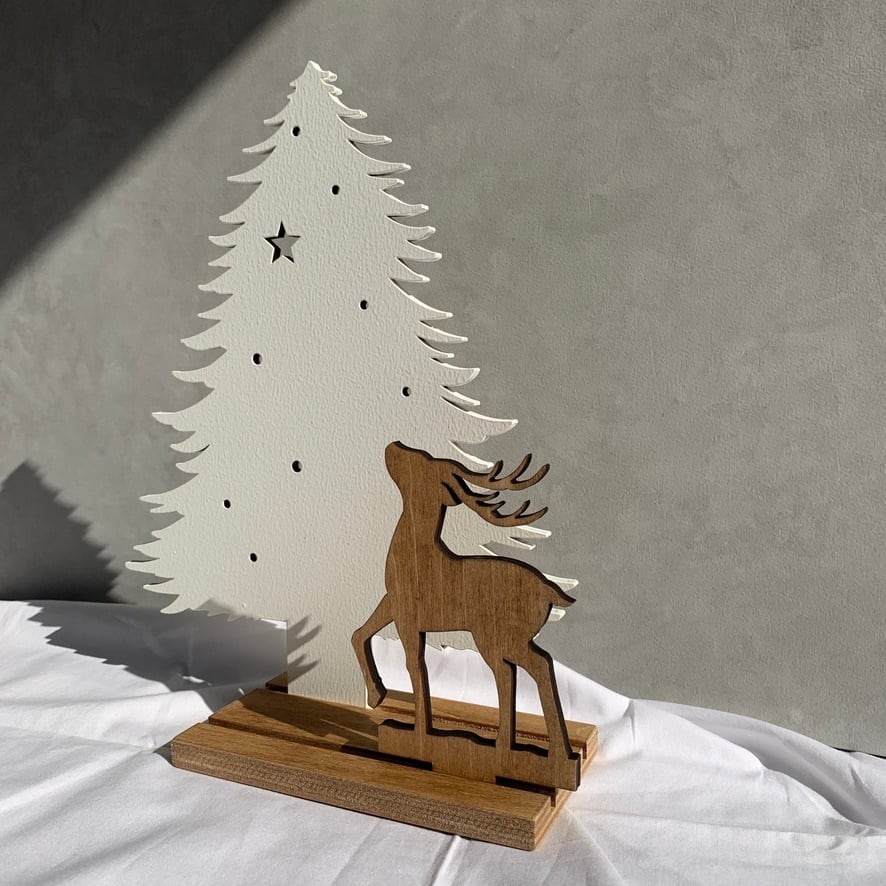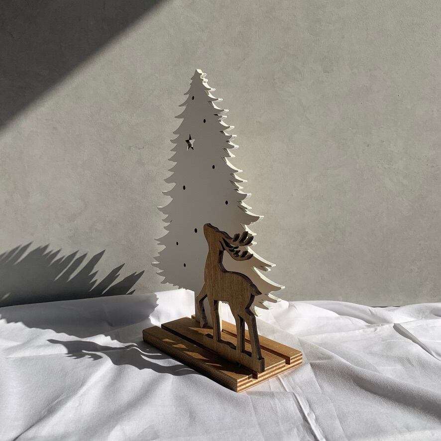木製のトナカイとクリスマスツリーがセットになった、