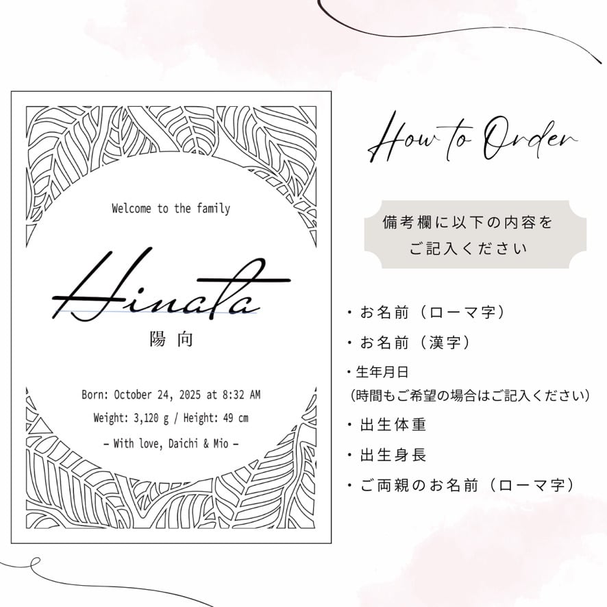 お子さまのお名前・生年月日・身長・体重を彫刻し、やさしい木の風合いと繊細なレーザーカット装飾で仕上げました。