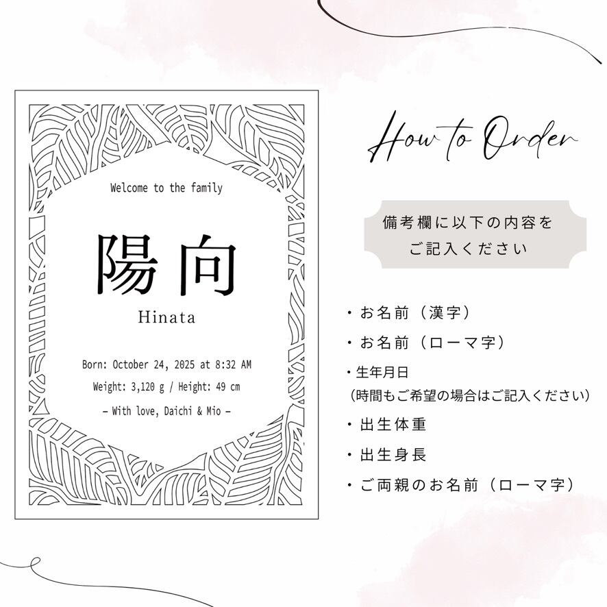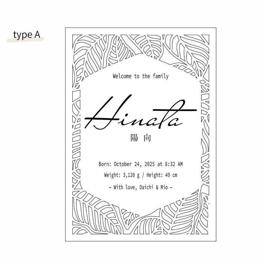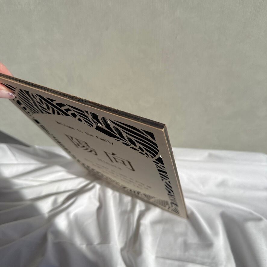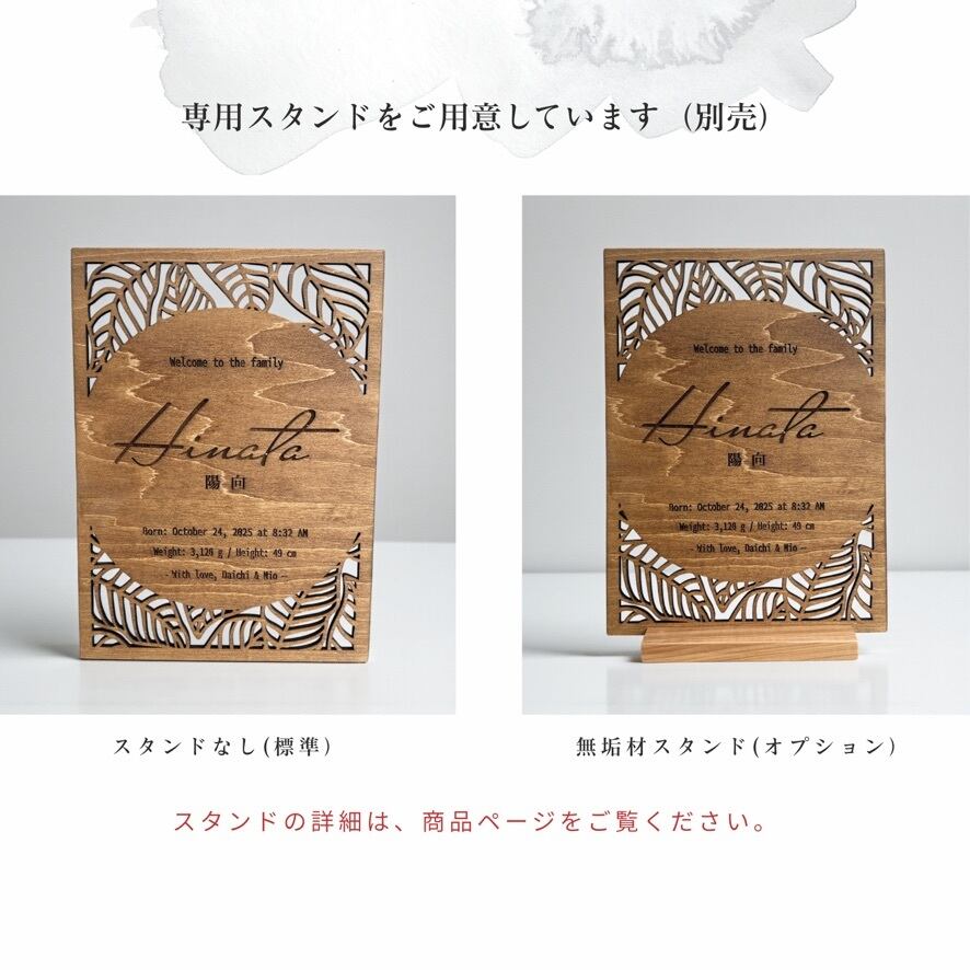 お子さまのお名前・生年月日・身長・体重を彫刻し、やさしい木の風合いと繊細なレーザーカット装飾で仕上げました。