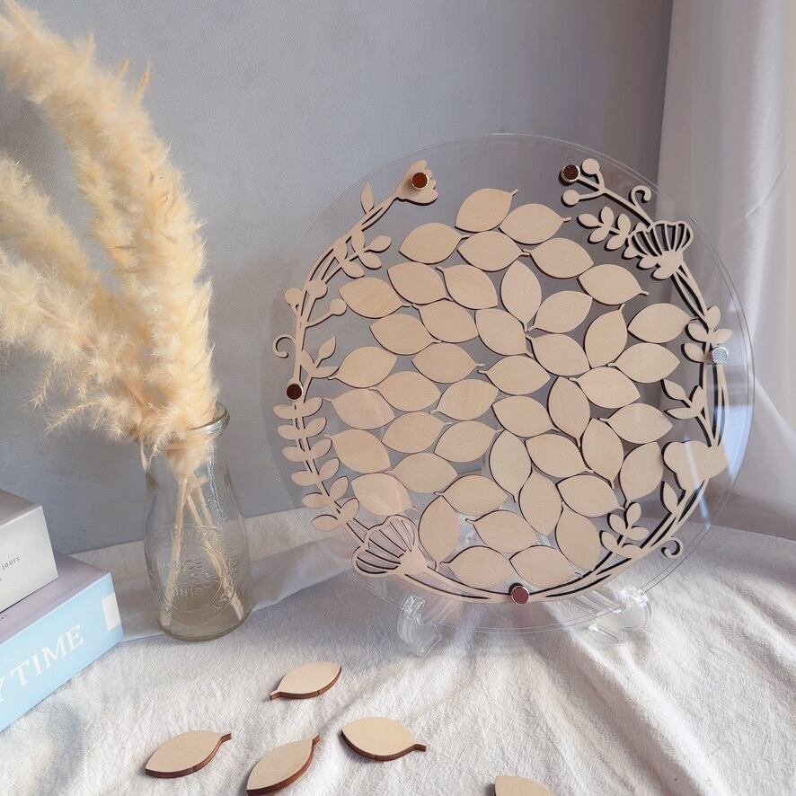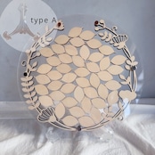 ゲストの皆さまに木製チップへお名前やメッセージをご記入いただき、フレームへ入れて完成させる参加型の結婚証明書。