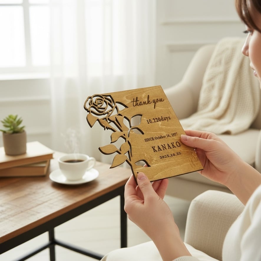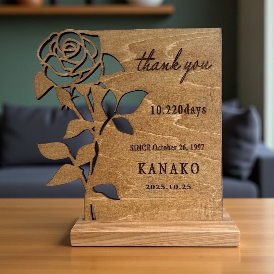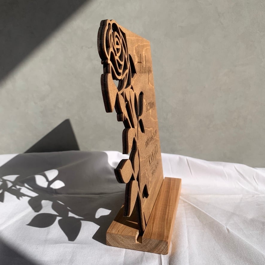 木製感謝状/子育て感謝状/バラ/ローズデザイン/出産祝い/結婚式/両親への贈り物/オーダーメイドギフト/名入れ/木製雑貨/ナチュラルインテリア/レーザー彫刻/薄型/ハンドメイド/家具職人の手仕事/北欧ナチュラル/日本製
