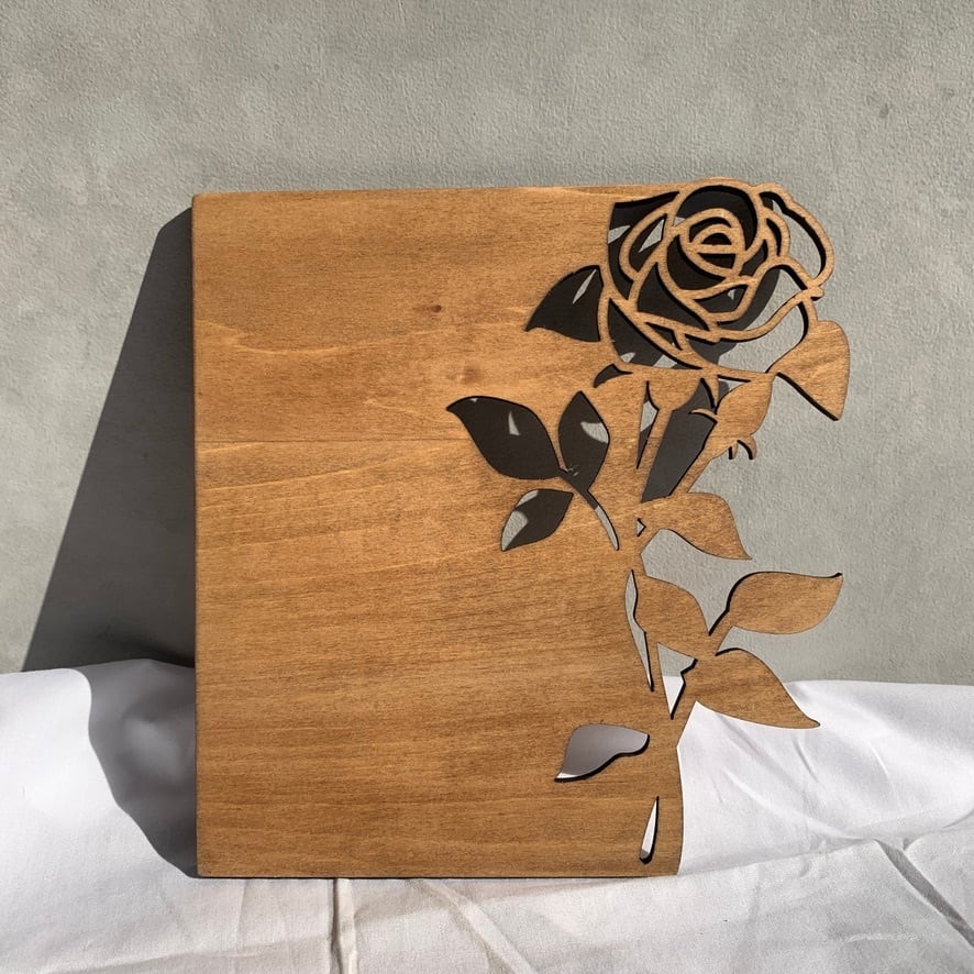 レーザー彫刻で丁寧に仕上げたバラの切り抜きが